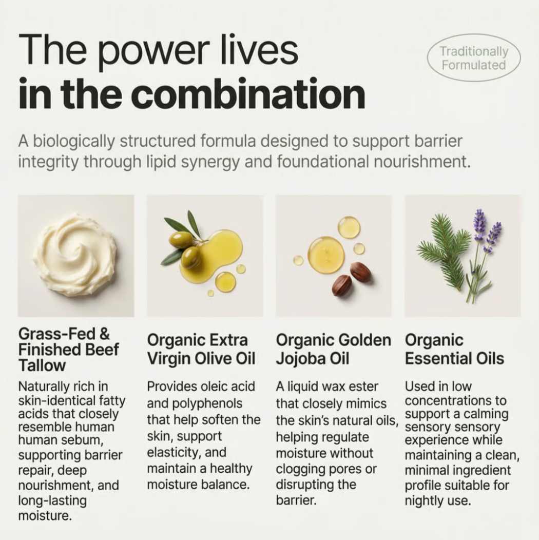 ✓ Skin-identical lipid profile that mirrors natural sebum ✓ Deeply nourishes without clogging pores or trapping impurities ✓ Strengthens the skin barrier while you sleep ✓ Supports calm, balanced skin even for sensitive types ✓ Helps reduce dryness, irritation, and environmental stress